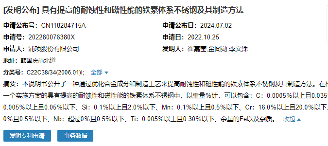 2024年7月2日,浦项股份有限公司成功申请一项名为“具有提高的耐蚀性和磁性能的铁素体系不锈钢及其制造方法”专利,申请公布号CN118284715A,申请日期为2022年10月25日。