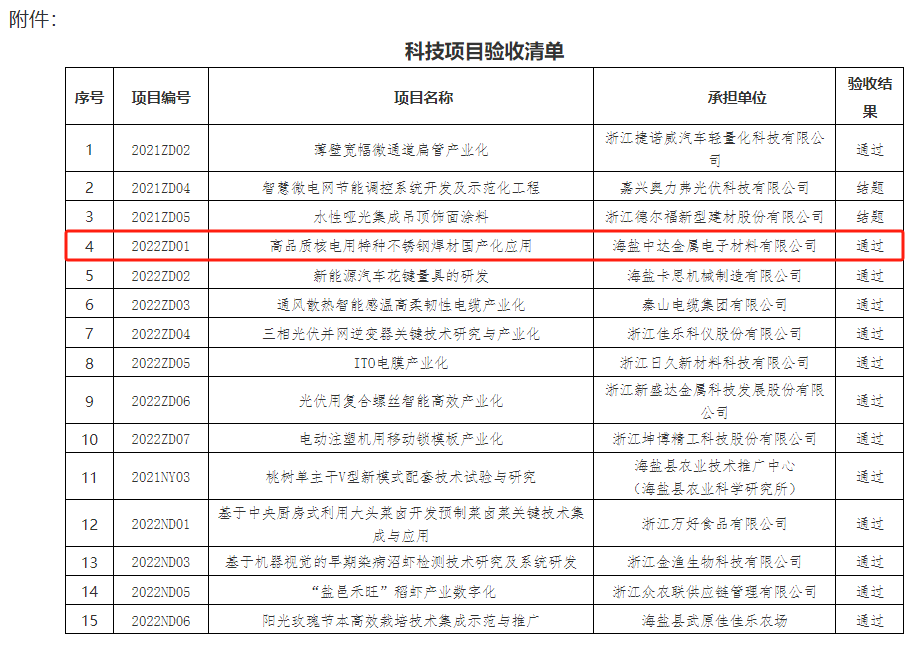 据科技项目验收清单显示,由海盐中达金属电子材料有限公司承担一项目高品质核电用特种不锈钢焊材国产化应用获验收通过。