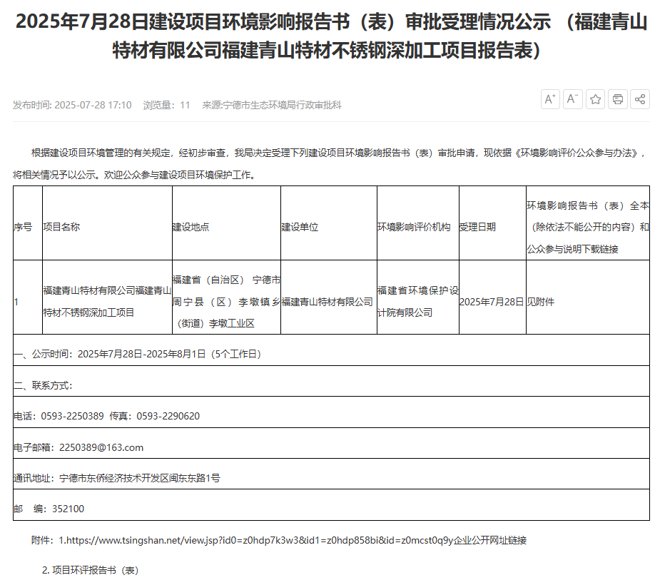 2025年7月28日,宁德市生态环境局受理福建青山特材有限公司福建青山特材不锈钢深加工项目环境影响报告表并对外进行公示,公示时间:2025年7月28日-2025年8月1日(5个工作日)。